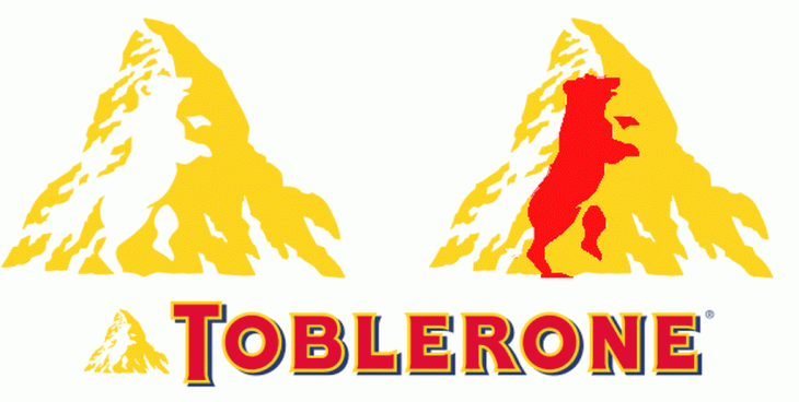 ▼三角巧克力(Toblerone):咖啡色的山脈中隱藏著熊的輪廓,巧妙將瑞士名產,高山和伯爾尼的暱稱,「熊之城(The City of Bears)」,結合在一起。